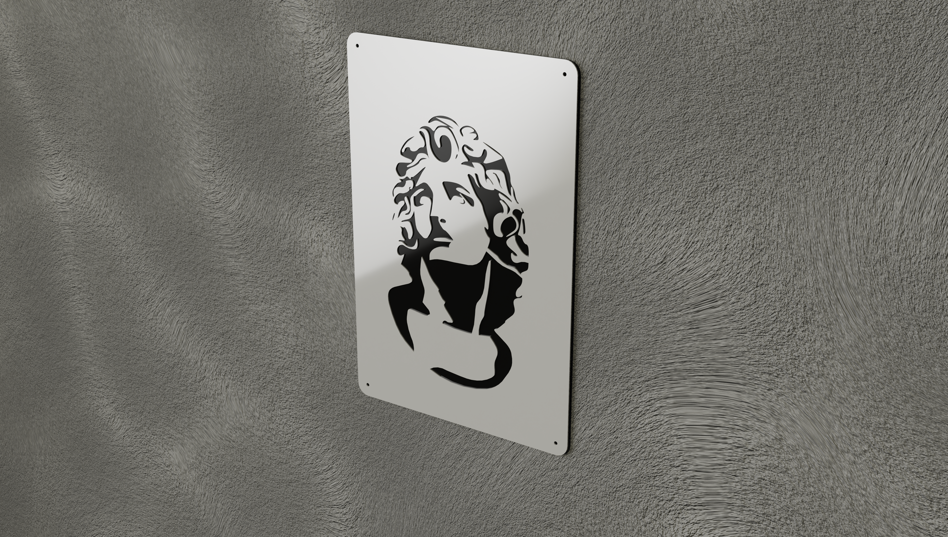 🔹 Двослојна изработка – горна плоча со ликот на Александар Велики и долна бела метална позадина што создава длабочина, контраст и сенка која го истакнува неговиот величествен профил.