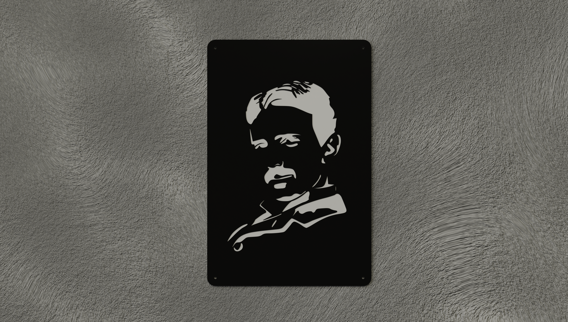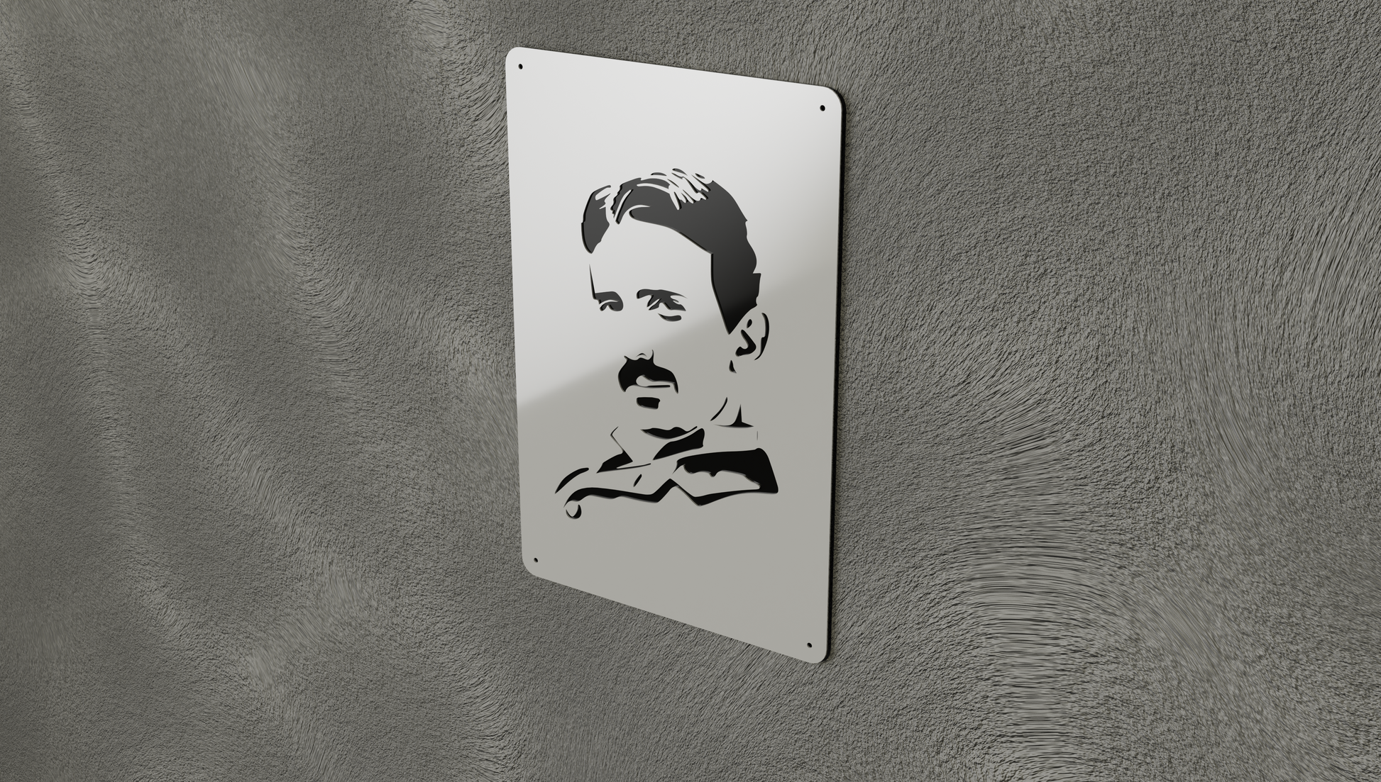 🔹 Двослојна изработка – горна плоча со ликот на Никола Тесла и долна бела метална позадина која создава ефект на светлосна игра и висина, како блесок на електрична енергија.